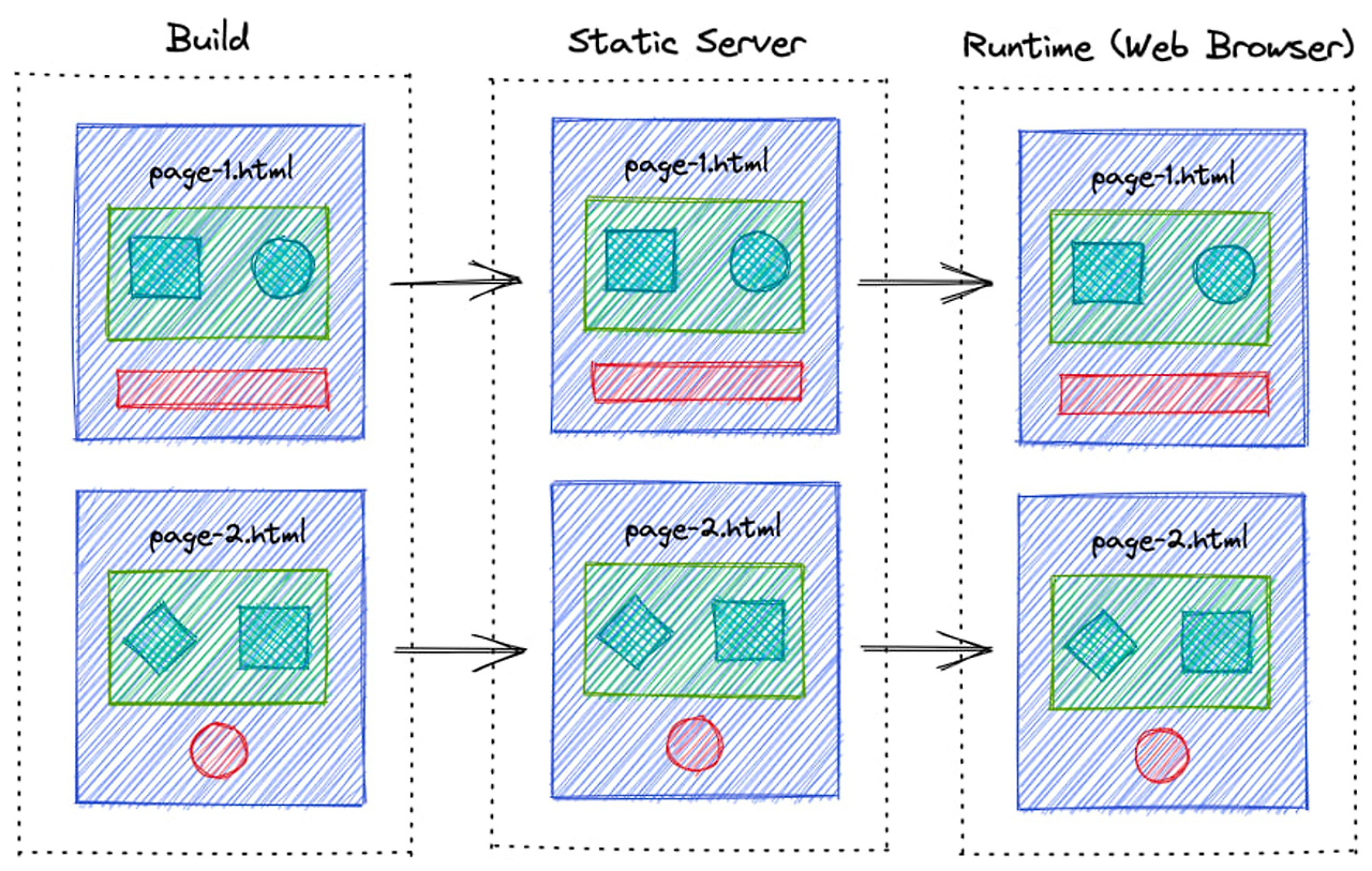 이름에서 처럼 사전에 미리 정적 페이지를 만들어놓는다. 이후 클라이언트에서 홈페이지를 요청하면 서버에서 만들어져있는 사이트를 바로 제공하여, 브라우저에서는 UI를 띄워주면 된다.