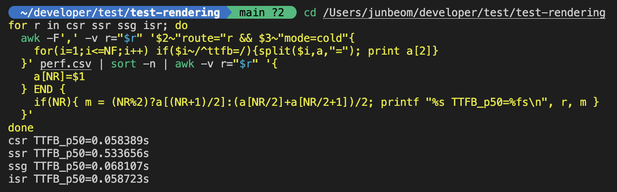 csr TTFB_p50=0.058s ssr TTFB_p50=0.533s ssg TTFB_p50=0.068s isr TTFB_p50=0.058s