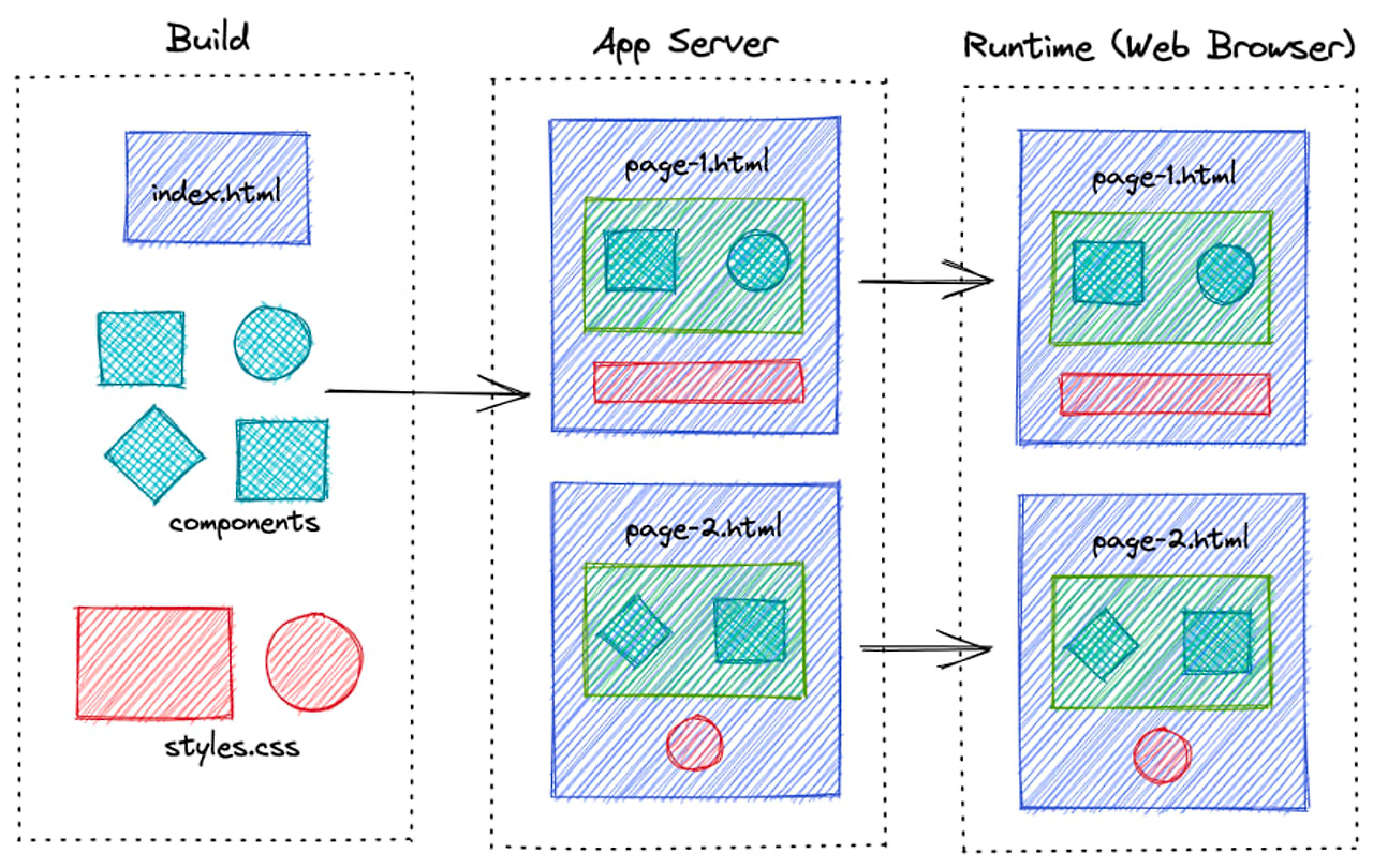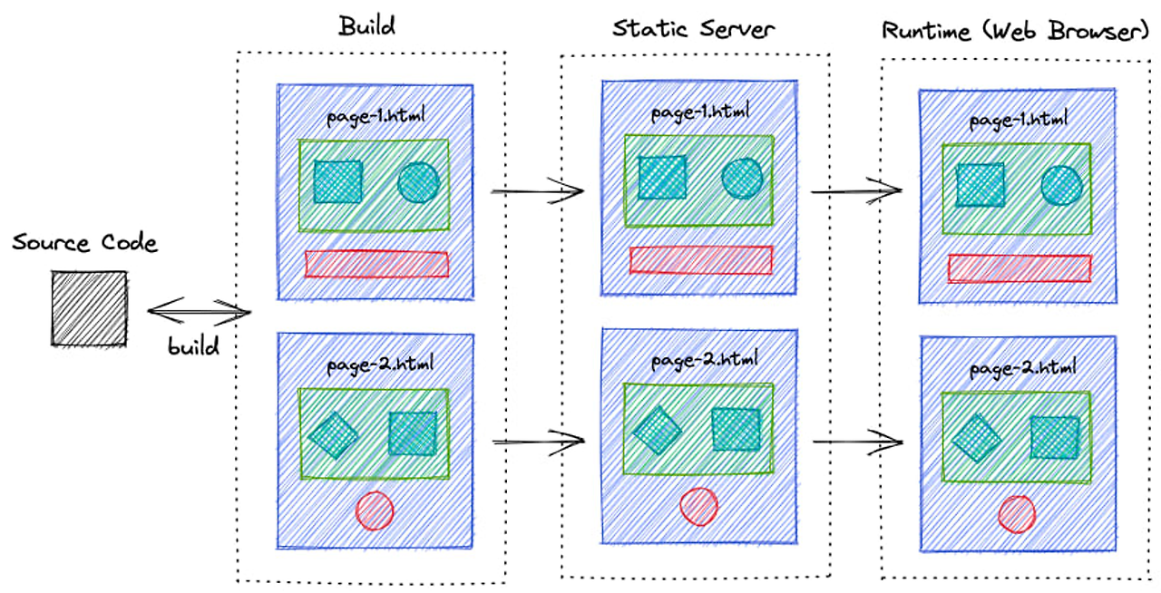 이름에서 처럼 사전에 미리 정적 페이지를 만들어놓는다. 이후 클라이언트에서 홈페이지를 요청하면 서버에서 만들어져있는 사이트를 바로 제공하여, 브라우저에서는 UI를 띄워주면 된다.